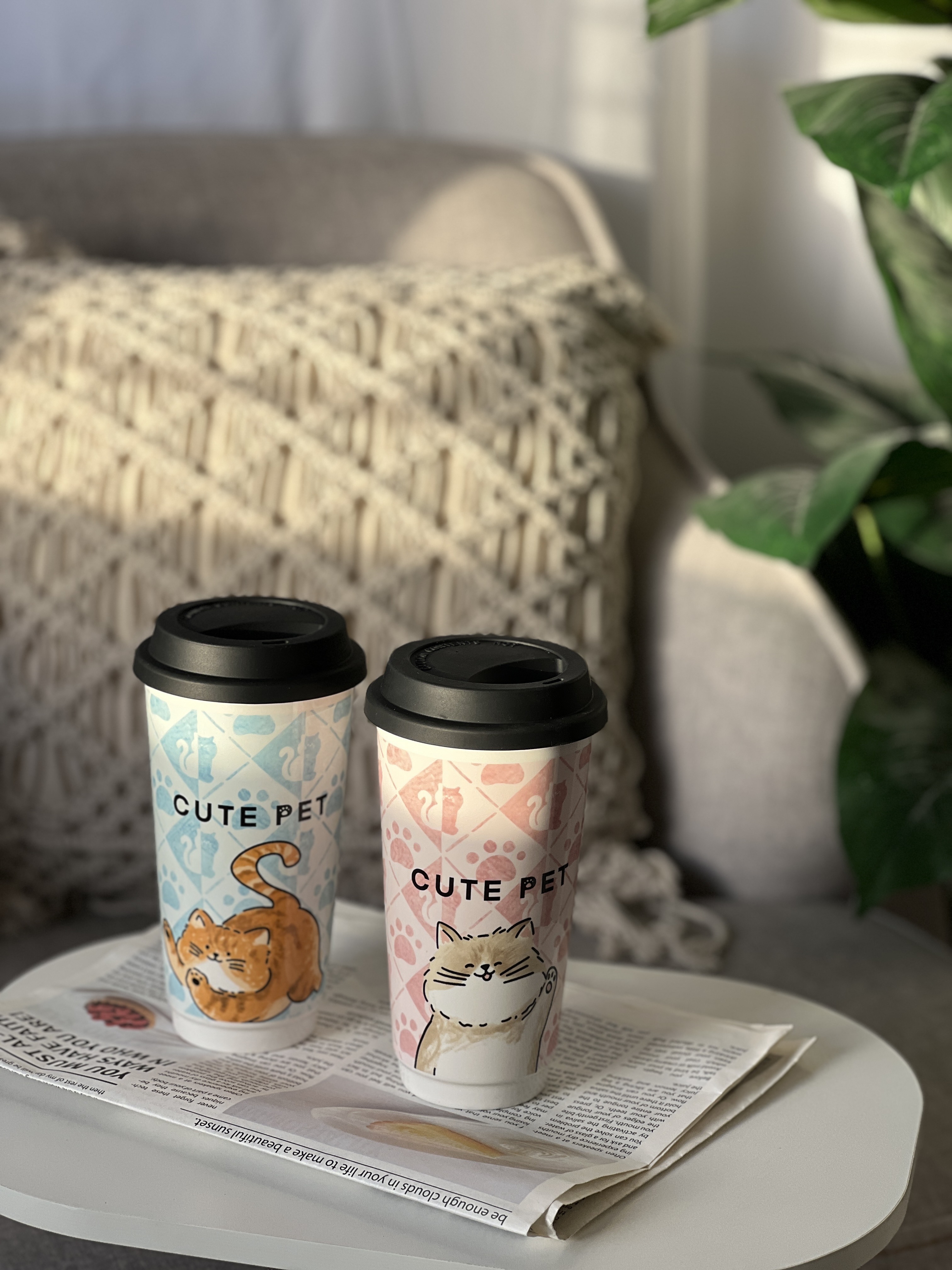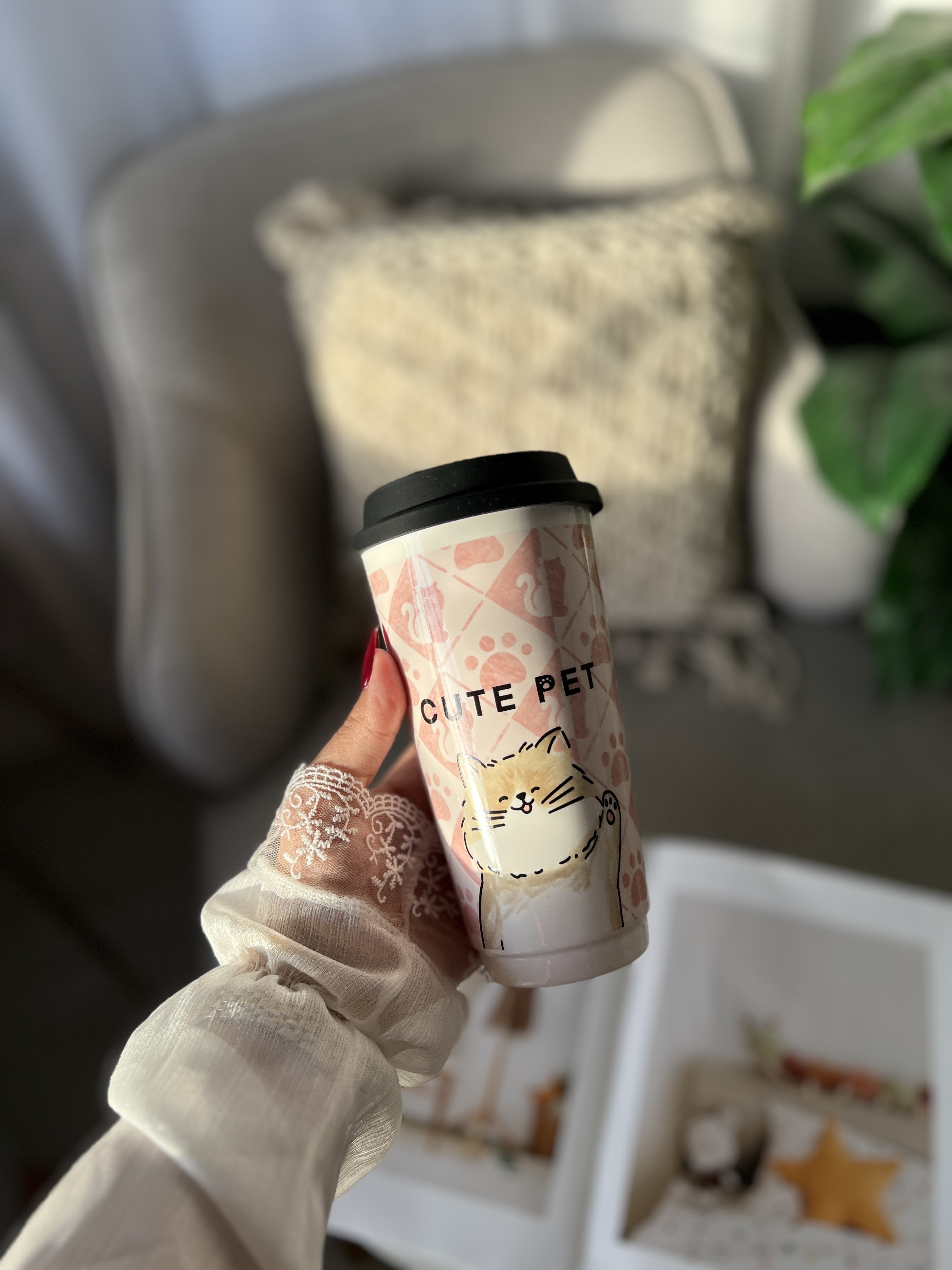 كوب القطة باللون الزهري حجم كبير مع عطاء سيلكون يساعد في حفظ الحرارة